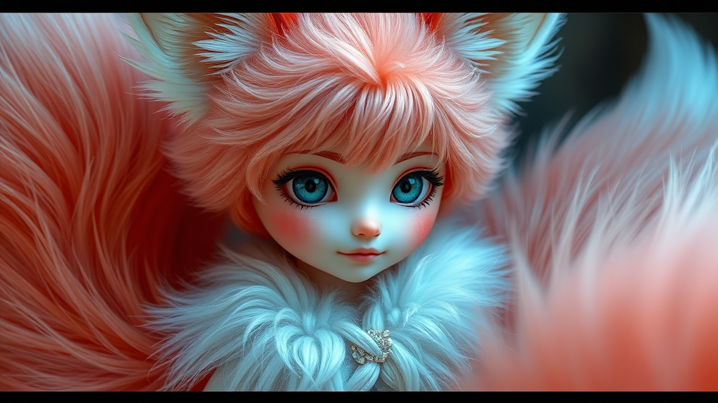 Fluffy nine-tailed fox girl, hyper-realistic, highly detailed photography, professional 8k resolution, soft and natural lighting, CGI, 3D art, doll-like features, merging elements of cartoon and anime styles, illustration and digital painting, vibrant colors, seamless blend of realism and fantasy, imperfections like skin spots and blemishes for added authenticity, intricate anatomy details, capturing the essence of ethereal beauty, whimsical, dreamlike atmosphere, cropped composition with subtle hints of JPEG artifacts for an artistic touch.