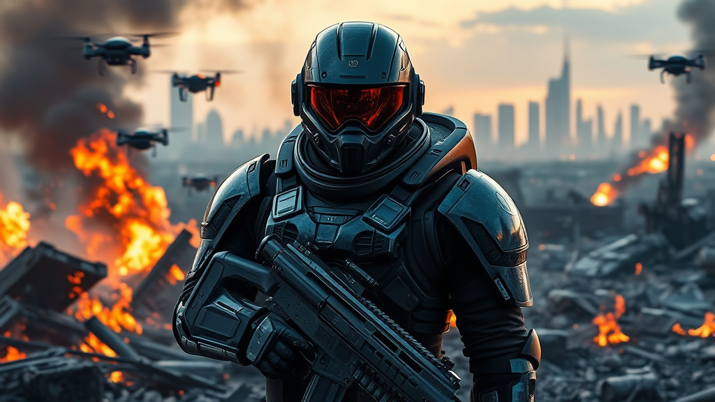 A highly detailed sci-fi futuristic soldier clad in advanced armor stands amidst a war-torn battlefield. His high-tech weaponry gleams beneath a sleek visor, which reflects the fiery glow of burning wreckage surrounding him. Hovering drones zip through the smoky air, their silhouettes darting against a backdrop of chaos. In the distance, the skyline of a futuristic city looms, its spires piercing the horizon. The scene is bathed in dynamic lighting, casting dramatic shadows and highlighting the intricate details of the soldier's gear against the ravaged landscape.