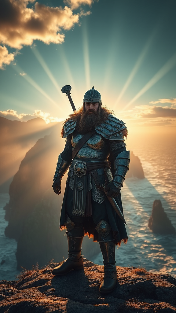 A majestic Viking warrior stands proudly on a windswept cliff, his intricately detailed armor glinting under ethereal fairy lights that dance around him. The atmosphere is vividly photorealistic, with dynamic elements depicting the rush of coastal winds. Soft volumetric rays pierce through a misty dawn, casting a magical glow over the scene in vibrant HDR. In the expansive background, towering mountains and a surging ocean add to the breathtaking vista, capturing the essence of epic adventure in a 9:16 aspect ratio.