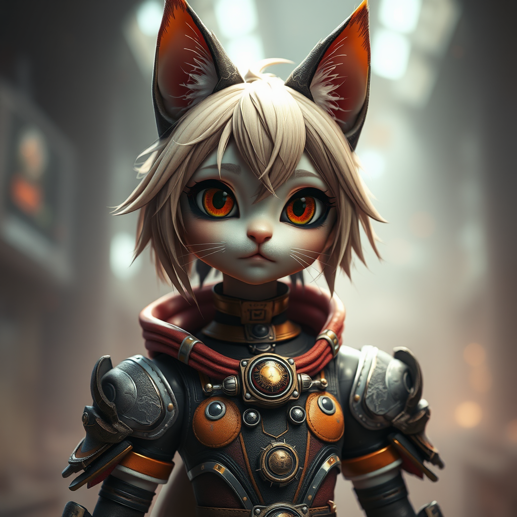 A whimsical cat girl character inspired by the styles of Yoji Shinkawa and Guweiz, rendered in the unique, bold style of Borderlands using Unreal Engine and Octane Render. The scene features an 8k UHD composition with stunning raytracing and cinematic lighting, showcasing a playful yet mysterious atmosphere. The character's expressive eyes and delicate features are complemented by an elaborate costume that blends fantasy and sci-fi elements. She stands confidently in an immersive environment with a depth of field effect, enhancing the overall visual impact. Attention is given to maintaining high-quality textures and clarity, avoiding any signs of distortion or anatomical inaccuracies, resulting in an engaging and dynamic portrait that captivates the viewer.