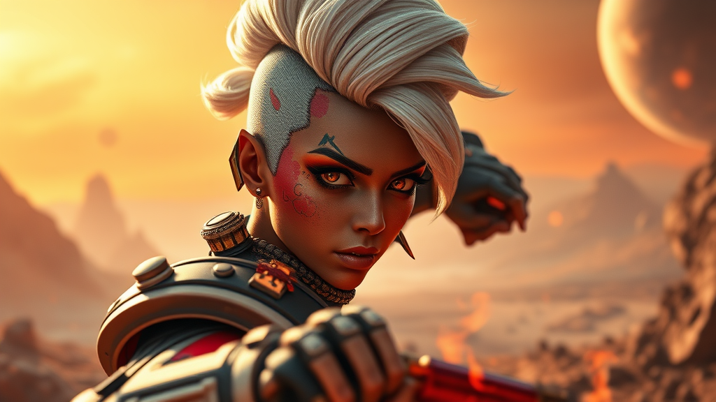 A stunning, high-quality, realistic depiction featuring vibrant, cinematic lighting captures a fire warrior with striking updo white hair and captivating eyes, set in the Warhammer 40k universe as a Shas Warrior. This fanart showcases vivid details and bold colors, with the dynamic character posing aggressively against the backdrop of an alien planet's detailed landscape. The scene, infused with sci-fi elements, benefits from a 50mm prime lens and F/2.8 aperture, delivering hyper-realistic, lifelike textures with photorealistic clarity in 8k resolution. The sharp focus and use of unreal engine enhance the visual impact, while avoiding errors like poor anatomy or disjointed limbs, maintaining an impressive aesthetic without blurriness or unattractive mutations.