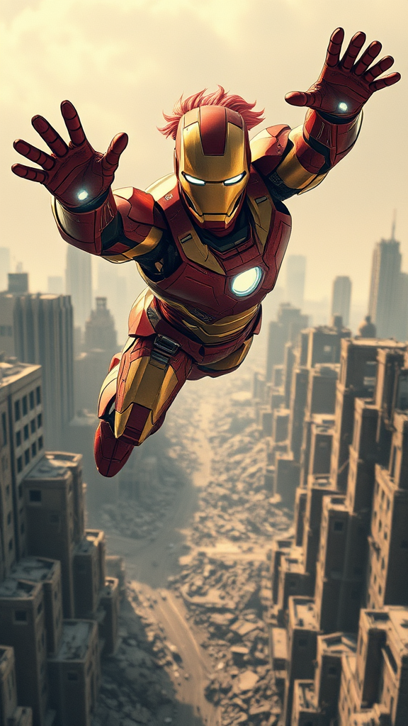 RAW photo of Ironman caught mid-flight in a dynamic and intense scene, surrounded by a backdrop of city ruins, captured in 8k uhd with dslr precision. Soft lighting enhances the high-quality image, adding a touch of film grain reminiscent of a Fujifilm XT3 illustration. The style blends 3d rendering with sepia tones, incorporating elements of painting, cartoons, and sketch art. The image embodies an analog feel, with unexpected details like pink hair and a slightly abstract, artistic interpretation. Overall, the piece conveys action and suspense, with a mix of retro and modern aesthetics.