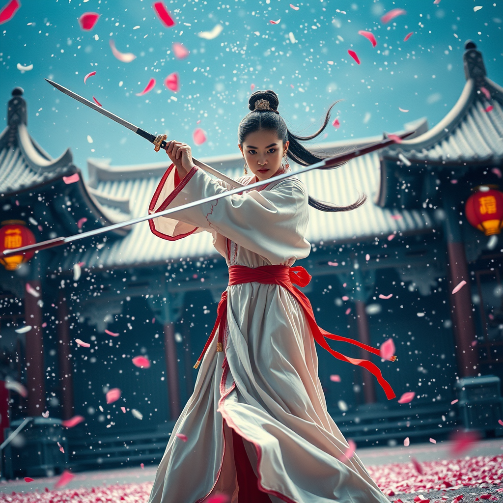 Amidst the swirling snow and fluttering petals, a 16-year-old Chinese girl, strikingly beautiful in her flowing Hanfu, wields her sword with fierce precision. Standing at the heart of an ancient temple, she moves gracefully, embodying martial arts mastery as she defends herself in a cinematic spectacle. The scene glows with a kaleidoscope of colorful lights, lending a fairy tale aura to the moment. The highly detailed setting, illuminated with dramatic and realistic lighting and shadows, creates a stunning panoramic view. Captured in a dynamic, breathtaking 35mm shot, it showcases a harmonious blend of tradition and fantasy.
