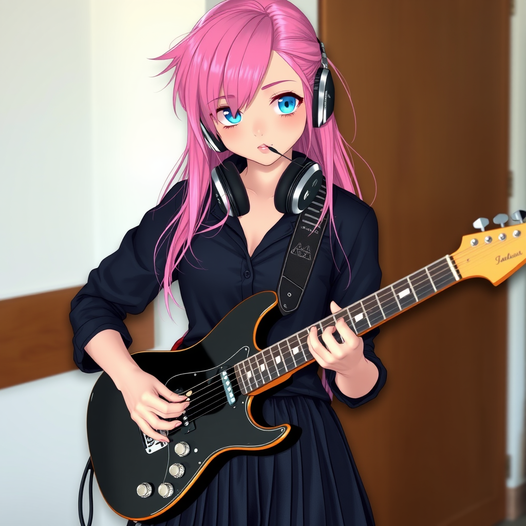 A girl with striking blue eyes and long pink hair styled in a unique one-side-up fashion stands indoors, absorbed in the music she creates. Her pleated black skirt sways slightly as she moves, complementing a sleek black shirt that hints at her edgy style. In her hands, she cradles an electric guitar, its strings resonating under her skilled touch. Headphones rest around her neck, and a plectrum is poised between her fingers as she plays passionately, her focus entirely on the instrument that brings her so much joy.