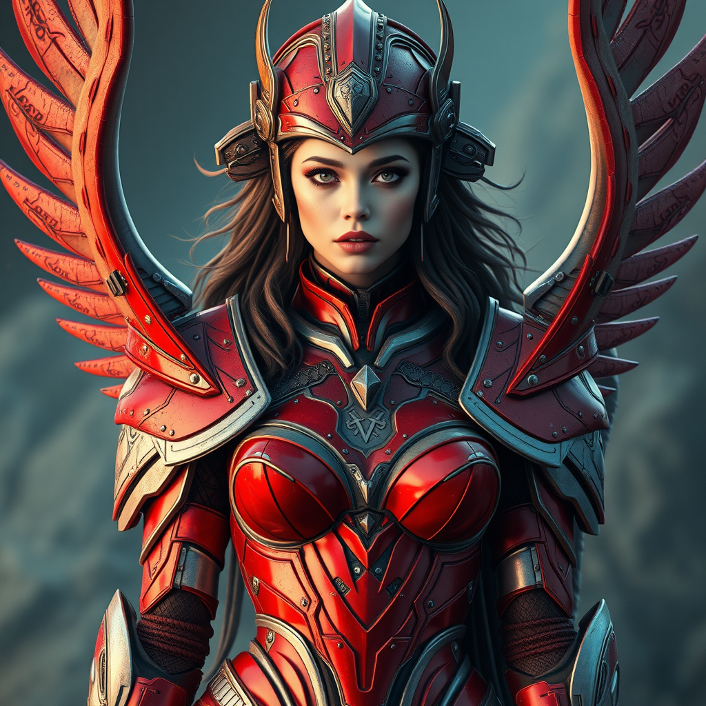 Goddess warrior knight in sci-fi setting, adorned in beautiful futuristic space armor. Her attire is decadent and divine, reflecting celestial elegance with intricate, battle-worn details. The hyperrealistic aesthetic showcases her red armor, a masterpiece of ultra-realistic and cinematic craftsmanship. The scene captures her in a moment of celestial grace, with highly detailed armor that seems to tell stories of past battles. The imagery remains captivating despite intentional imperfections—such as text errors, missing fingers, extra digits, cropped portions, jpeg artifacts, and signs of battle wear. The depiction reveals elements of bad anatomy and poorly drawn features like hands and feet, yet the overall character maintains its striking divine appearance amid deformed and misshaped details, reminiscent of a cosmic tapestry that includes intentional flaws. The presence of watermarks and low-resolution artifacts adds layers to this mutant, gross, yet intriguingly beautiful depiction.