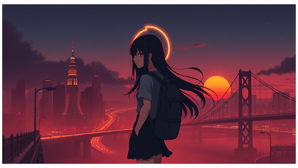 masterpiece, exceptional detail, minimalistic color scheme, subtle contrast, single female character, flowing straight black hair, glowing halo, wearing a backpack, gazing into the distance, standing still, ambient smoke, twilight cityscape, vibrant sunset, illuminated skyscrapers, expansive bridge, scattered road signs, layered perspective, bordered frame, rich black, deep red, warm orange, earthy brown, fall season, gentle haze