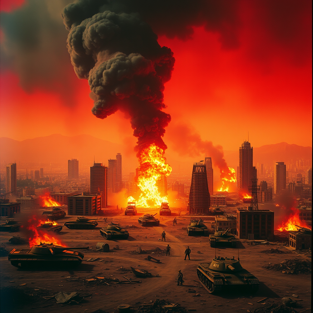 A 70mm cinematic portrait unveils a backdrop of a forsaken, post-apocalyptic wasteland, with the skeletal ruins of Los Angeles sprawling out in all directions. The cityscape is consumed by roaring flames, as charred tanks and crumbling buildings erupt in fiery chaos, amplifying the desolation. The sky casts a deep, blood-red hue, while thick, obsidian clouds of smoke spiral upwards from the blazing metropolis. Every detail is captured with an exquisite level of film grain and texture, bestowing a palpable, cinematic essence to the scene. The color palette is somber and subdued, punctuated by vibrant bursts of flames that heighten the drama and urgency. This rendering conveys a raw, dynamic intensity, drawing the viewer into a vortex of suspense and high-stakes action.
