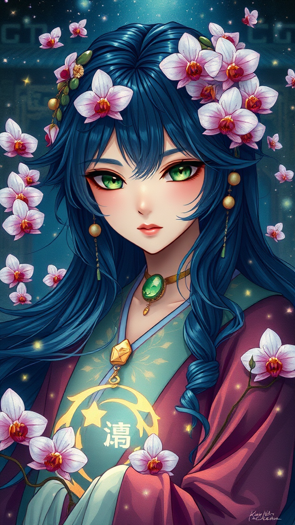 A mysterious anime sorceress from the Tang dynasty with an intricate orchid hair accessory and a delicate jade charm, captured at midnight in an ancient temple. Her emerald green eyes and midnight blue hair cascade around a celestial star ornament. The mystical landscape around her flourishes with the style of Kay Nielsen, featuring flowing robes that shimmer under mystical lighting. She gazes directly at the viewer, all framed in a wide-angle portrait. Orchid blossoms drift around her like magical sparks, with light shining like countless stars in the night sky. The scene is a mixed media rendering, a fusion of vibrant hues and enchanting textures, with an expressive essence that illuminates her ethereal presence.