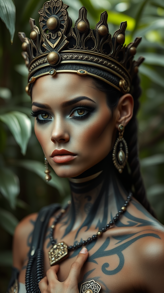 A realistic photograph capturing a three-quarter full-body portrait of a warrior queen. She stands with confidence amidst a lush jungle background, her ornamented robotic parts glistening subtly in the soft lighting. Her crown is intricately designed, complementing the tribal tattoos that accentuate her regal presence. The queen's intense, piercing eyes are adorned with delicate jewelry, adding an air of elegance. Her skin is rendered with extreme detail, showcasing texture, pores, and a beauty spot that marks her cheek. The composition is sharp in focus, with realistic reflections enhancing the depth of the portrait. An 80mm lens at f1.2 captures her beauty in vibrant National Geographic-like quality. Her long neck and bold features are prominent, despite slightly exaggerated proportions that lend an artistic flair. Contrasts of shadow and bright lights highlight her form, while a subtle scar adds character to her visage. The image avoids the pitfalls of poor artistry, with every element meticulously crafted—hands are well-defined, showcasing deft precision, and the composition remains fully in frame, avoiding any blurriness or unwanted reflections. The overall aesthetic is one of beauty and strength, captured in a vibrant, hyper-realistic style.