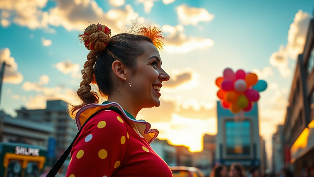A cheerful woman dressed as a playful clown, with a colorful harlequin outfit, happily walking through the bustling city streets as a brilliant sunset paints the sky. Her cute hairstyle features vibrant, bouncy pigtails. The side view captures her infectious smile under the warm, volumetric lighting. In the background, a cluster of balloons dances in the partially clouded skies, evoking a sense of whimsical joy. The scene is reminiscent of Kodak Portra 800's nostalgic tones, which enhance the lively and heartwarming atmosphere.