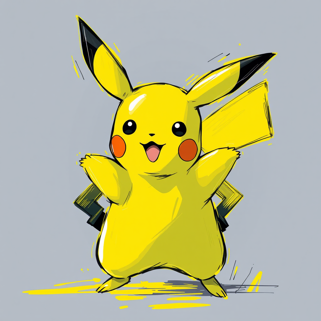 Pikachu in a dynamic stance, anime-inspired sketch, abstract brush strokes with heavy lines, captured in HDR Neo-Noir style with a bright yellow neon palette, minimal yet evocative.