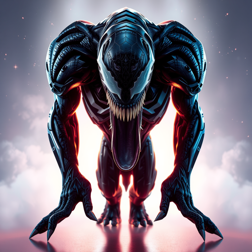 Marvel Comics' Venom emerges in a breathtaking 4K, 3D revelation, standing character illuminated by gently cascading soft lighting, a cosmic embrace highlighting its hyper-detailed form. Subtle pastel hues, like whispered tales, color the canvas of Venom's narrative portrayal. In the whimsical spirit of Skottie Young, this 3D Blender creation unfolds Venom's epic saga, where each detail is an eloquent brushstroke in the cinematic tapestry. The polycount crafts a symphony of modular constructivism, a dance of Pop Surrealism in a physically based rendering display. The result is a square image, rich and vivid, an epic cinematic odyssey captured in Venom's lifelike essence.