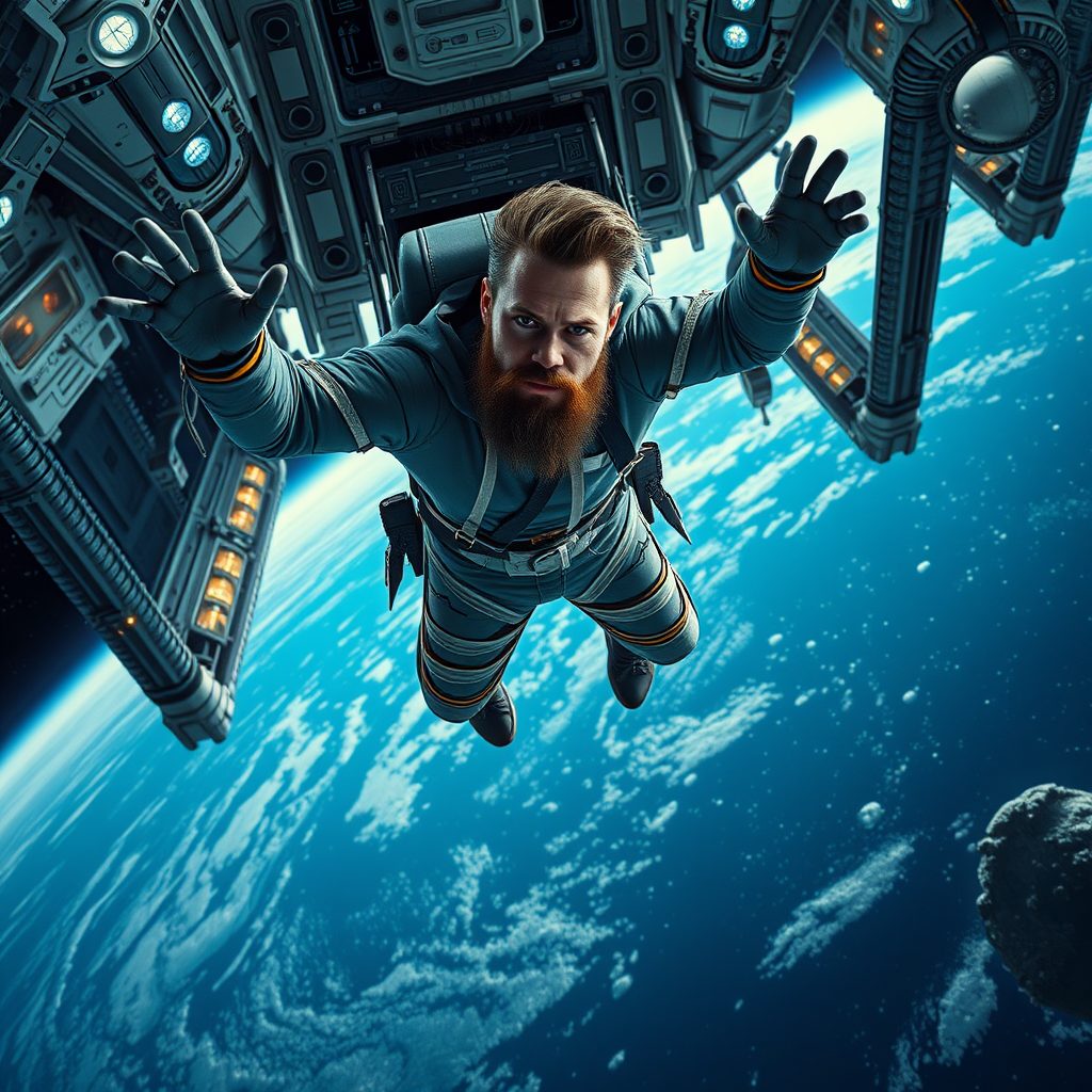 A detailed image of a man in a weightless state, surrounded by the vivid colors of space. He is gracefully approaching a meticulously designed space station, with an expansive view of the Earth below. The scene is set against a backdrop of a starry sky, with rich, dark blue tones dominating the composition. The photorealistic details highlight the striking design of the spaceship. Two faces of Matthias Schoenaerts appear as a form of artistic concept, contrasting against elements like a motorbike and biker, embodying a sci-fi theme reminiscent of Ironman. The focus remains on the human form, avoiding anatomical inaccuracies, while emphasizing creative elements such as long beards, pointed footwear, and intricate shoelaces. Despite these artistic choices, the representation remains coherent and fluid, ensuring the image maintains its balance and photorealistic quality without succumbing to abstraction or distortion.