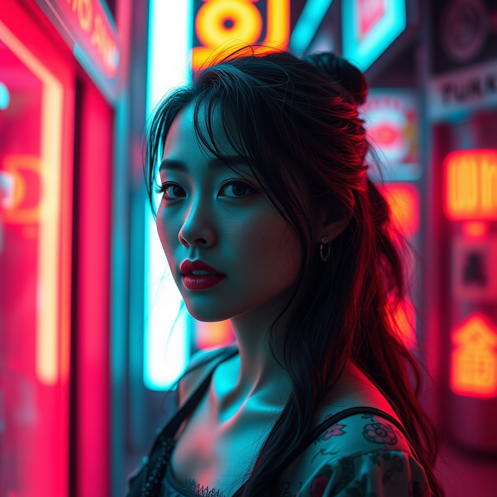 A full-length portrait of a woman bathed in neon lights set against a vibrant background, rendered in the style of vray tracing with an emphasis on stylized portraiture and layered lines. Inspired by Asian aesthetics, the image features hyper-realistic details and intense close-ups, with contrasting shadows creating depth. The scene is infused with neon art nouveau styles and hyper-realistic sci-fi elements, highlighted by pop art brightness and silhouette figures. Dominated by light cyan and light crimson hues, the artwork reflects the intricate, complex layers and textures reminiscent of Paul Corfield's style. Captured using a Fujifilm X-T4 and Sony FE 85mm f/1.4 GM lens, the composition focuses on raw, yet refined visual storytelling.