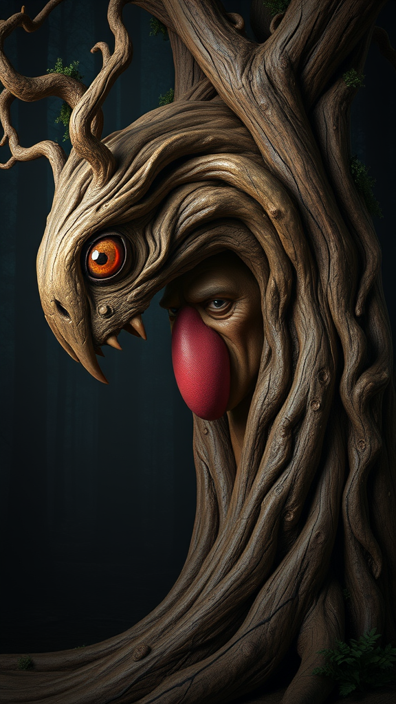 A terrifying wood creature emerges, its form twisted and gnarled, with a single piercing red eye glowing ominously amidst the shadows. Styled like the works of Filip Hodas and Sandy Skoglund, yet bearing the intricate detailing distinctive of Natalia Rak, this creature resides in a mysterious jungle that seems both anthropological and otherworldly. Its hyper-realistic features are rendered in stunning 32k UHD, capturing every sinewy fiber and grotesque texture of its form, like a masterpiece of fear itself. Nearby, a sinister man with a bulbous red nose melds seamlessly into the bark of a towering tree in the dark forest, forming an unsettling visage that evokes the eeriness of ZBrush creations. Evoking the vivid style of colorful woodcarvings and the whimsical yet eerie vibe of frogcore aesthetics, this scene also hints at Lovecraftian nightmares. It features characterful animal portraits scattered throughout, each infused with lifelike details that jump out in the pristine clarity typical of DAZ3D, rendering a diorama of hyper-realistic, hyper-detailed horror.