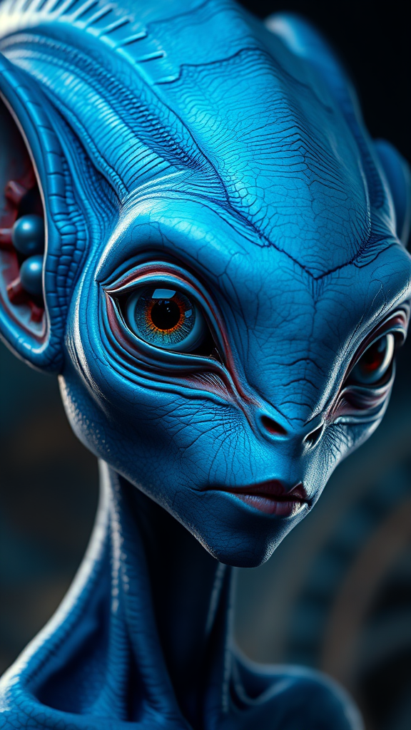 A captivating portrait of a blue alien with a single large eye and prominent, expressive ears, featuring a medley of vibrant and contrasting colors. The character is meticulously designed with an intricate and symmetrical face, showcasing hyper-realistic and expertly detailed skin. The setting is illuminated with dramatic, cinematic lighting, enhancing the epic sci-fi and fantasy atmosphere. The digital painting highlights a realistic texture, achieved through ultrarealistic detailing and sharp focus, delivering an 8k masterpiece in digital art. This striking character design maintains a sharp, clear focus, emphasizing every minute detail while preserving the majestic symmetry and depth of an advanced sci-fi universe. This distinctive yet slightly abstract approach offers a fresh twist to the original concept, imbuing it with a unique charm.