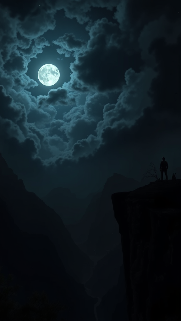A mysterious and cinematic landscape unfolds with a lone figure standing on a cliff, gazing out over a shadowy and foreboding valley. The figure is silhouetted against a sky filled with roiling clouds, where a full moon casts an eerie luminescence across the scene. The valley below is steeped in shadow, with glimpses of gnarled trees, jagged rocks, and deep chasms hinting at secrets hidden in the gloom. The scene is imbued with an atmosphere of dark intensity, capturing a moment of solitude and suspense against the vast, moody backdrop, as stars faintly twinkle through breaks in the ominous cloud cover.