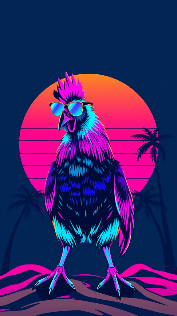 A vibrant 80s retro t-shirt design featuring a synthwave chicken sporting sleek, angular sunglasses, confidently standing against a minimalist sunset characterized by bold, geometric lines and vivid gradients. The scene is set with a deep, midnight blue background, with the chicken's feathers reflecting neon shades of cyan and magenta, creating a striking contrast. The chicken's pose is dynamic, as if ready to strut through a futuristic landscape, while palm trees in silhouette subtly frame the composition, adding an extra layer of retro-futuristic flair.
