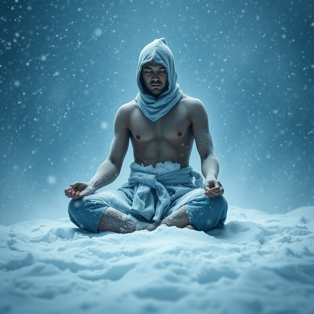 In a hyper-realistic, cinematic scene, a lone ninja sits in deep meditation amidst a furious blizzard, his body partially enveloped by layers of snow. Clad solely in a traditional Japanese fundoshi, his bare skin is layered with frost and snow, yet he exudes an aura of tranquility. With a cross-legged stance and hands resting gently on his knees, the ninja's calm demeanor contrasts starkly with the tumultuous storm around him. Despite the relentless snowfall and howling winds, he remains still, allowing the snow to accumulate on his shoulders, arms, and legs. His skin shines with frost, a testament to his immense inner strength and unyielding focus, untouched by the freezing conditions. The blizzard persists, swirling snow and ice through the air in a chaotic dance, yet it feels distant compared to the ninja's serene meditation. Volumetric light beams punctuate the storm, casting delicate, ethereal shines on him and the snow beneath, creating a dreamlike shimmering effect. This harsh storm is depicted through a cold palette of pale blues, whites, and icy grays, emphasizing isolation and the environment's severity. The ninja's minimal attire in traditional fundoshi enhances the serenity amidst chaos, suggesting he's transcended the physical realm to become one with the elements around him.