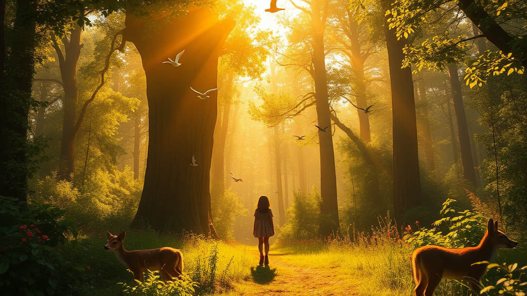 In a vast, enchanted forest bathed in the golden glow of a radiant sun, a girl wanders amidst the vibrant life forms around her. Birds soar overhead, their silhouettes dancing against the bright sky. Amid the lush greenery, fawns peer curiously through the trees, raccoons scuttle playfully across the forest floor, and a cunning fox flicks its tail, watching from a distance. The sweet aroma of wild strawberries fills the air, adding to the symphony of nature. Towering trees, with their leaves rustling softly, create a mystical canopy painted in the rich, warm hues of a Hayao Miyazaki masterpiece. The scene is captured in stunning 8k HD, where the contour light highlights every detail with high contrast and exquisite depth of field, blending photorealism with a touch of cinematic magic. The viewer feels a sense of gigantism—as if part of this spellbinding world through a first-person perspective—capturing the intricate textures of bark and foliage in super-realistic detail. A dark, moody tone lingers, underscored by an evocative bokeh effect, crafting an epic frame that blurs the line between reality and fantasy.