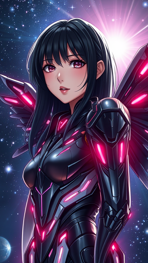 A stunning close-up portrait of a beautiful girl with a dreamy face, featuring black long hair and a slender figure, clad in an intricately designed Sci-fi exo suit. The suit is a glossy black and silver with insectoid elements, blending seamlessly into a powerful and detailed Sci-fi mech. The mech is equipped with futuristic, insect-inspired wings, evoking the styles of Tsutomu Nihei and Akira. The scene is set against the dramatic backdrop of outer space, with bright quasar light and cascading starlight illuminating the galaxy. Complex lighting and plasma beams add depth and a sense of motion. The composition is captured in 8k Ultra High Definition, showcasing hyper-realistic anime art with rich graphics and dramatic volume graphics in an elongated portrait ratio.