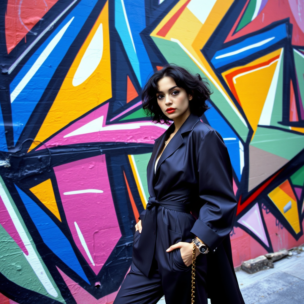 A 1990s street photographer in Santiago captures a poised model posing against a vibrant backdrop of abstract graffiti composed entirely of sleek, colorful geometric shapes. The model's outfit harmoniously merges with the vivid mural, showcasing an intricate interplay of color and form reminiscent of Tokyo Fashion Week.