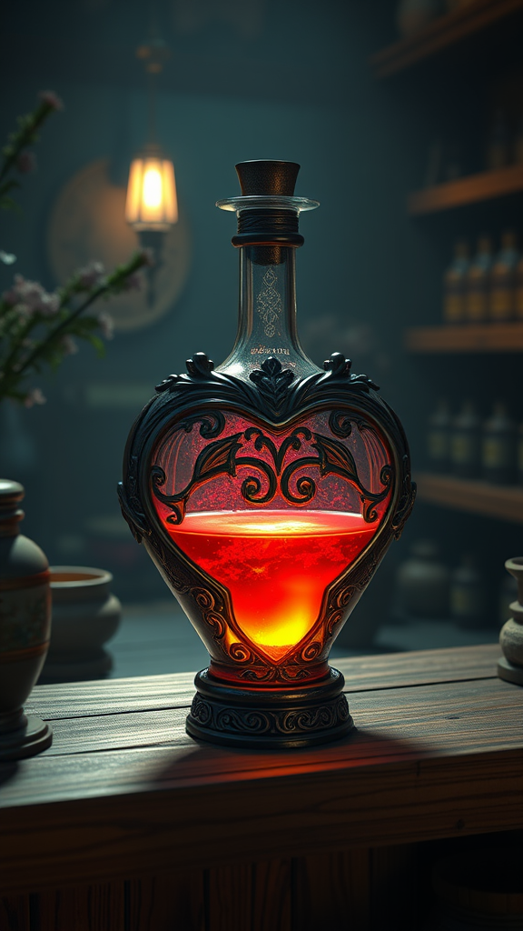 A meticulously detailed love potion in a heart-shaped flask rests on a wooden shelf within an ancient apothecary, the room filled with the mystic ambiance of a fantasy world. Designed as a videogame asset, the scene is captured in stunning 8k resolution using cinema4d and octane render, showcasing extreme detail and high sample quality. The magic potion glows softly within the flask, its vibrant colors reminiscent of enchanting Studio Ghibli art. Intricate carvings and ornate designs embellish the bottle, while the dim lighting casts gentle shadows, creating a cinematic and immersive atmosphere.