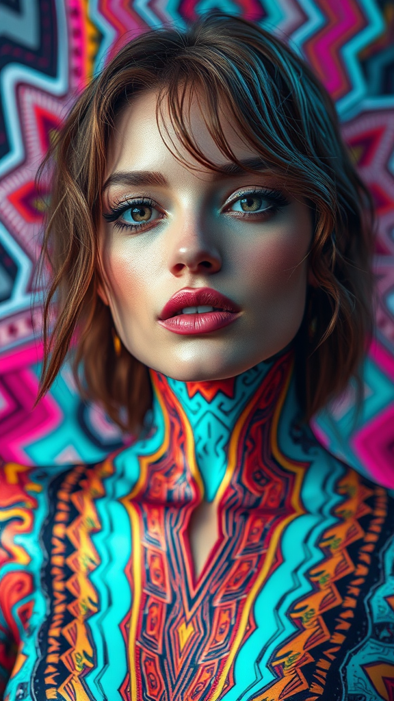 Full body image, hyper-realistic DMT-inspired fashion photoshoot featuring a stunning model. Eyes wide open, intricate abstract digital art infused with vibrant DMT aesthetics, pop art influences, and vray rendering. Bold zigzag patterns, graceful and emotive poses, subtle hints of robotic expressionism, capturing an ethereal yet avant-garde essence.