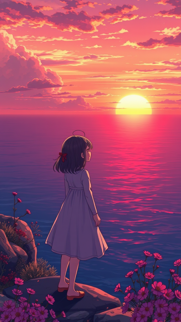A serene anime visual of a charming young girl gazing at a vibrant sunset over the endless ocean, standing gracefully on the edge of a rocky cliff, her hair gently tousled by the sea breeze, surrounded by wildflowers swaying softly, as the sky transitions from warm hues of orange and pink to deep purples and blues, reflecting a tranquil yet awe-inspiring atmosphere.