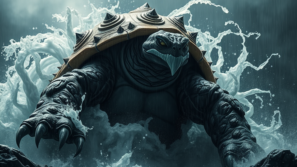 Storm-empowered dark Pokémon Blastoise, a colossal turtle-like creature, unleashing a torrent of water with immense force, drenched and formidable, featuring an intricate and sinister design. The scene is dense and twisted, evoking a macabre atmosphere. Elaborate details define the creature's shell and features, with dramatic lighting accentuating the hyperrealism. The photorealistic, cinematic composition captures the terror-inducing moment in stunning 8k quality, creating an immersive experience in a 9:16 aspect ratio.