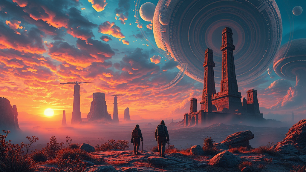 Adventurers traverse an otherworldly landscape, a stunningly detailed sci-fi masterpiece capturing an atmospheric and intricate scene in 4k resolution. The artwork evokes the styles of Gris Grimly, Richard Anderson, Donato Giancola, Larry Elmore, and Josephine Wall, revealing vivid alien flora and ancient ruins under a multicolored sky. Ethereal light bathes the explorers, blending mystery and wonder, as they journey into the heart of the unknown world, their silhouettes dwarfed by towering monoliths and swirling mist that hint at hidden secrets waiting to be uncovered.