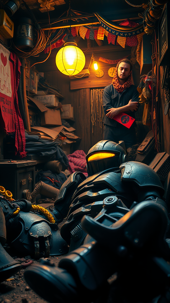 Wide angle shot of a chaotic and cluttered shack, capturing an action scene with a tattered and torn shirt, porcelain-like cracked skin, and a League of Legends vibe. The scene is vibrant, photo-realistic, dramatic, dark, and in sharp focus at 8k resolution. A robot knight with a glowing yellow visor lies destroyed in pieces, embodying a sci-fi cyberpunk aesthetic. This medium shot is intricate, with cozy indoor lighting reminiscent of Unreal Engine rendering, featured on ArtStation. It showcases detailed artwork inspired by artists like James Gurney, Katsuhiro Otomo, James Paick, featuring cinematic lighting, vibrant natural elements, and the influences of Craig Mullins, Greg Rutkowski, Pete Morbacher, and Tuomas Korpi. The atmosphere includes Tekkon Kinreet-style volumetric light, trending on ArtStation and created with Octane rendering. The piece maintains a studio photo quality with intricate details, highly detailed by Greg Rutkowski, focusing on the fusion of realism with creativity, avoiding typical clichéd prompts or overly stylized anime influences.
