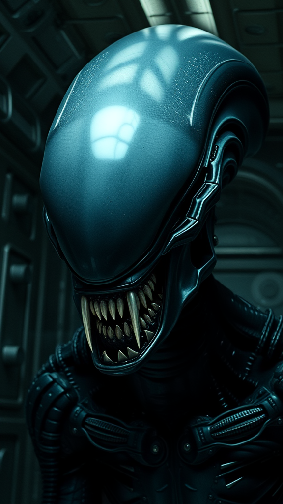 An intense portrait of an extraterrestrial entity reminiscent of the Xenomorph from the Alien franchise, featuring a sleek, elongated cranium with a polished, dome-like surface, completely devoid of visible eyes, delivering a chilling effect. The mouth is equipped with short, razor-sharp, metallic teeth, and a smaller secondary set of teeth extends from within like a miniature black apparatus with pointed edges. Its skin, a glossy, black exoskeleton, catches the light in a menacing manner, adorned with biomechanical ridges and interconnected tubes running along its head and neck. The backdrop is a dim, industrial setting within a spaceship, featuring metallic bulkheads, sporadic water drips, and swirling steam, heightening the creature's daunting presence. The lighting generates profound shadows across the alien's visage, accentuating its fearsome and ethereal characteristics.