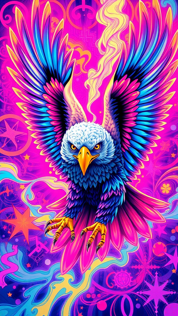A vibrant, technicolor eagle soars through a dreamscape of swirling neon hues, its feathers pulsating with an array of electric blues, intense pinks, and luminous oranges. The eagle's eyes, wide and expressive, reflect a kaleidoscope of shifting colors and patterns, embodying the spirit of a comic book hero from another dimension. The background is a vivid tapestry of abstract shapes and symbols, creating an otherworldly atmosphere that enhances the eagle's majestic and surreal presence.