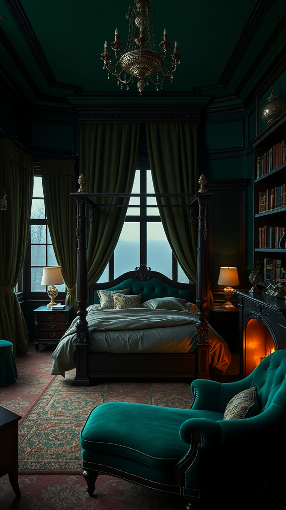 A luxurious bedroom infused with an aura of mystery and sophistication, featuring deep emerald green walls and rich, dark mahogany accents. Ornate silver fixtures glisten subtly in the dim, atmospheric lighting, casting intriguing shadows across antique furniture. Plush velvet drapes cascade from tall windows, framing a view of a misty landscape. A grand four-poster bed, dressed in silken bedding, stands as the room's centerpiece, flanked by elegant side tables adorned with serpentine motifs. Shelves lined with leather-bound tomes and curious artifacts add an air of intellectual charm, while a plush chaise lounge invites relaxation by a crackling fireplace. Subtle hints of luxe textures and intricate patterns culminate in a space that exudes both power and elegance.