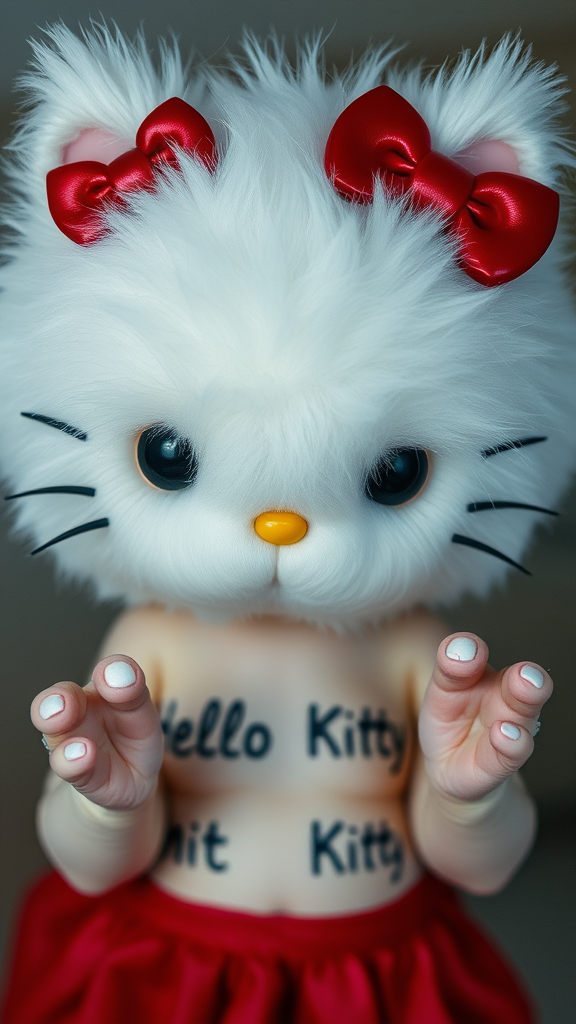 hello kitty as a human, sfw, fluffy white hair, signature red bows, cat-like features, charmingly imperfect anatomy, whimsical hands, abstract text, missing elements, extra or fewer fingers, cropped features, varied quality, jpeg nuances, artist signature presence, playful errors, imperfect symmetry, fantasy touch, logo elements, unexpected forms, alternate quality, intriguing textures, creative distortion, elongated forms, artistic nudity interpreted as vulnerability, humanoid fantasy, imaginative interpretation.