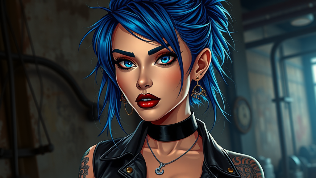 A woman with striking blue, tousled hair adorned with various piercings stands against a shadowy, industrial backdrop. Her piercing blue eyes and detailed facial features are highlighted by cinematic lighting. With an elegant posture, she wears a black choker and jewelry that glimmers subtly. Her lips are painted dark, complementing her bold, intricate tattoos that snake down her arm. She's clad in a leather shirt, revealing a navel piercing, embodying a rock aesthetic with a hint of rebellion. The smooth, highly detailed rendering brings out the realistic eye texture and bright eyes, adding a beautiful glow that enhances her expressive gaze. The scene, infused with a high-resolution, cartoon style, captures her allure and fierce individuality, set in a world where high detail and rock-inspired elegance intertwine seamlessly.
