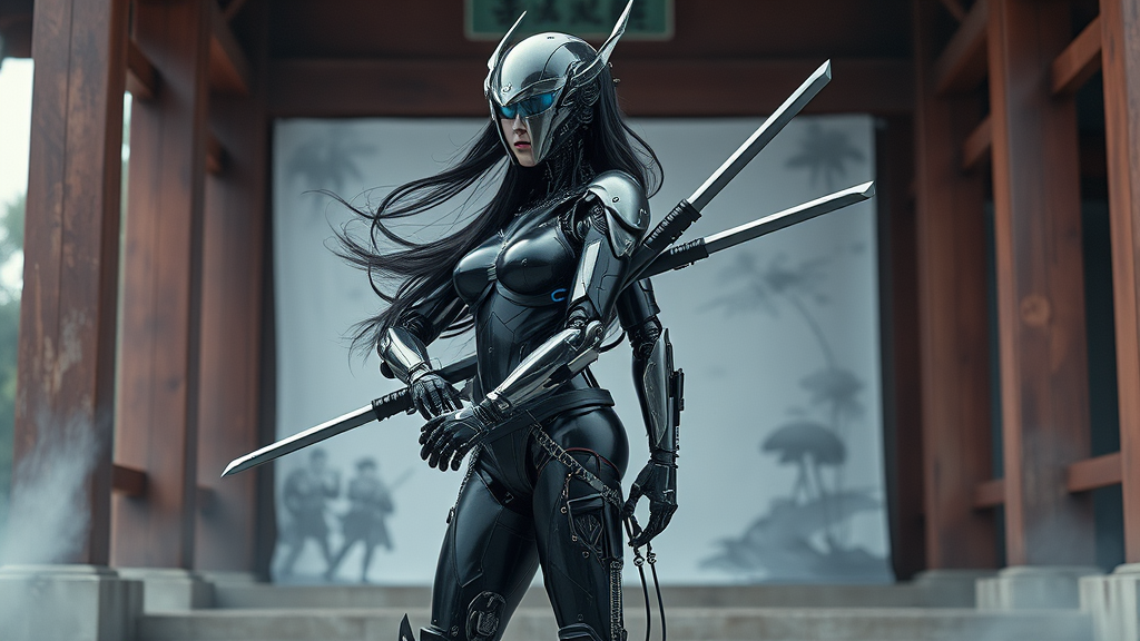 A full body view in the style of ck-sfc featuring a female cyberpunk robot samurai with a mirrored face shield and a hyperdetailed helmet. She has flowing black hair and wears reflective black armor highlighted with neon blue accents. Her body is intricately constructed of metals, cables, and wires with robotic joints visible. She stands barefoot, a sleek katana is strapped to her back. The scene is set against an abstract background, hinting at an eastern temple with futuristic elements subtly woven in, creating a harmonious blend of tradition and advanced technology.