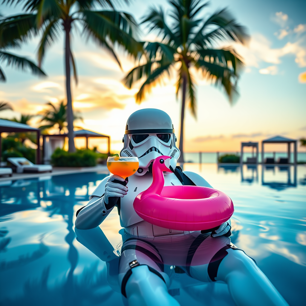 A stormtrooper lounging in a luxurious infinity pool, sipping a colorful cocktail, wearing an inflatable flamingo ring, palm trees swaying in the background and fancy poolside cabanas nearby, with a sunset sky casting warm hues over the scene.