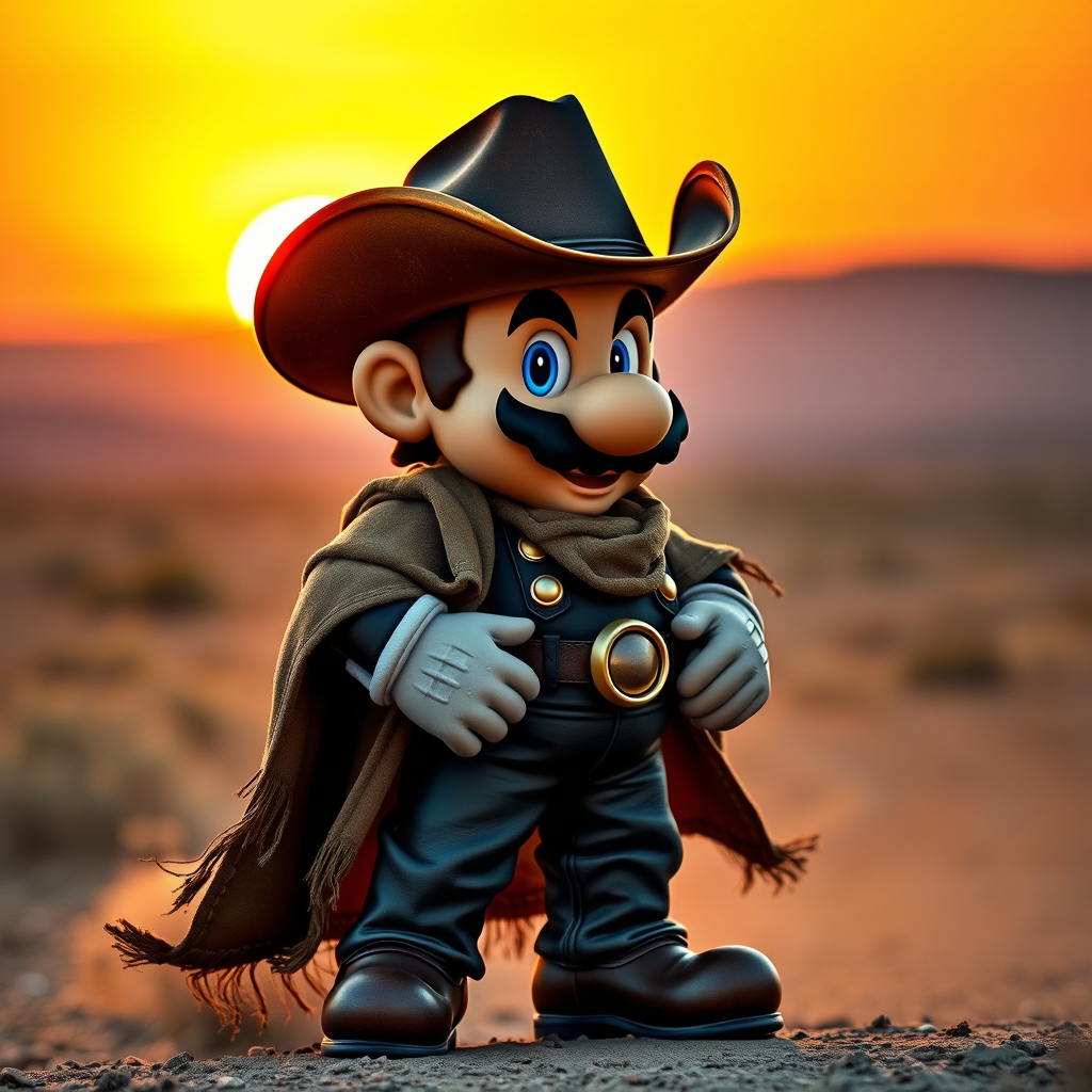 Super Mario transformed into a rugged cowboy from the Wild West, donning a worn poncho draped over his shoulder, a wide-brimmed cowboy hat tilted at a jaunty angle, and sturdy leather boots kicking up dust. His iconic mustache twitches as he peers into the distance, a black duster coat fluttering in the wind. The sun sets behind him, casting a dramatic silhouette as his hands rest confidently on his belt. The scene captures the essence of a motion picture, with Mario ready to embark on an epic frontier adventure.