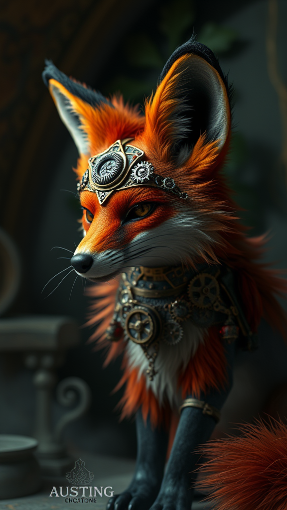 A steampunk red fox adorned with intricate gears and cogs, exuding a Lovecraftian aura of mystery and horror. The setting is a dark, atmospheric environment with surreal shadows cast by dim, magical lighting. The fur appears almost unreal, captured with ray tracing technology creating hyper-realistic details. The scene is viewed through a wide-angle lens, blending digital artistry with the essence of a realistic painting. Perfect for a DND character design, this fox stands out with its dramatic, photorealistic features, hinting at an enigmatic story. The composition balances the trending aesthetics of ArtStation with the mystical quality of magic photography, set against a backdrop of volumetric lighting that enhances the creature's sharp focus and excessive detailing. The environment hints at a world unseen, with soft natural and cinematic lights creating a vivid, concept art atmosphere steeped in the elegance of steampunk design.