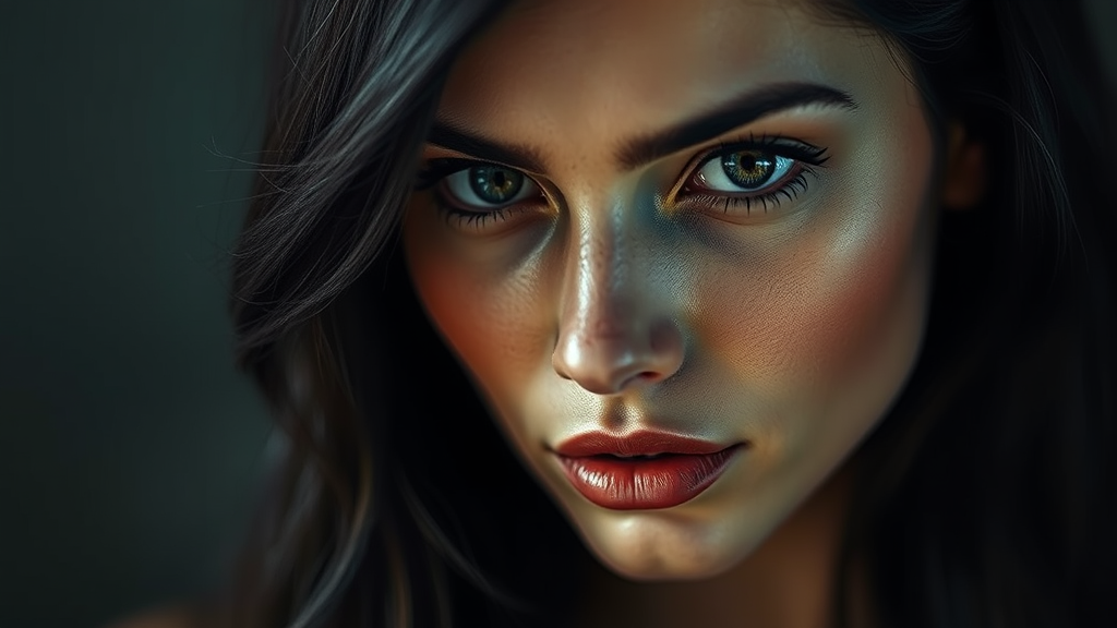 Radiant dark-haired woman with an intense gaze, portrait-style capturing her captivating features, her skin rendered with exquisite detail, realism akin to a photograph, ultra-high resolution, showcasing her full-length frame in vividly detailed RAW color tones, adorned with a subtle piercing, enveloped in gently diffused lighting, utilizing a soft focus and shallow depth of field, with a keen sharpness that emphasizes hyperrealistic quality, imbued with dramatic cinematic lighting.