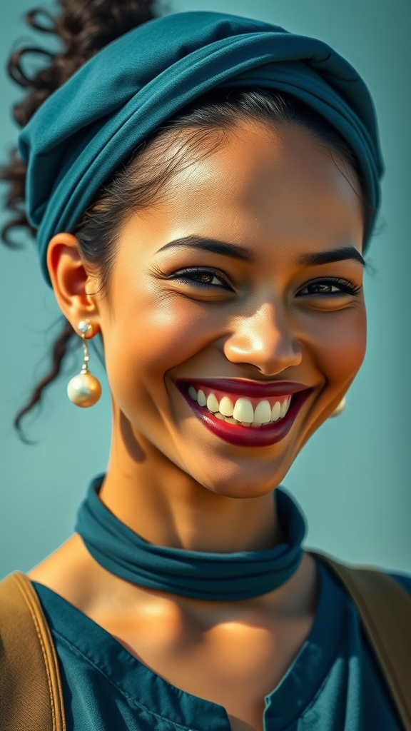 A joyful woman adorned with a pearl earring, depicted in hues of blue and khaki, radiates a meticulous yet carefree solarpunk charm, her smile embodying a serene and sustainable future.