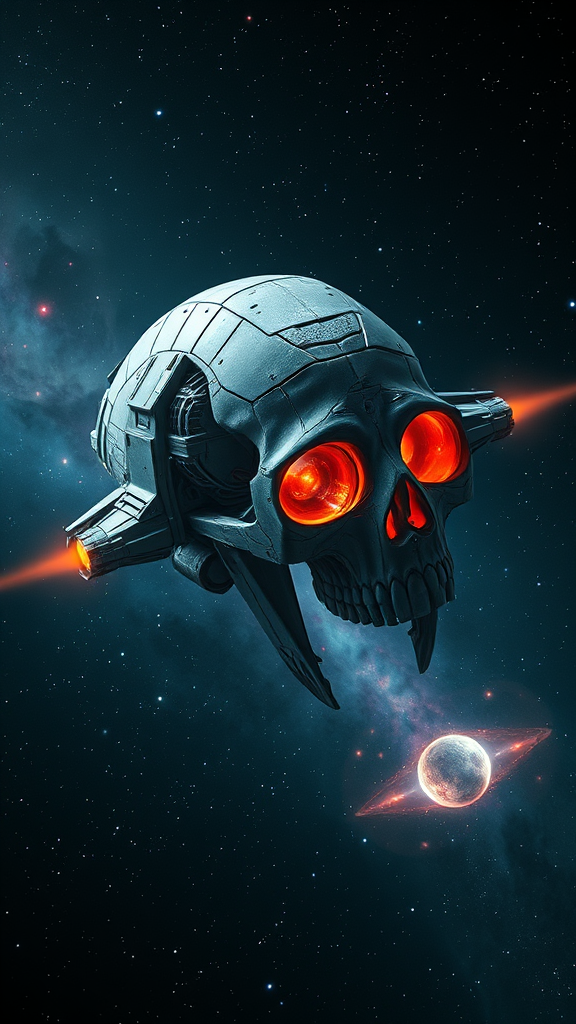 Skull-shaped spaceship soaring in a vast, dark cosmos, with an intricate, hyper-realistic design that embodies Sci-Fi and Futuristic elements. The image captures sharp details with stars and a vibrant nebula illuminating the backdrop, and utilizes ray tracing for a cinematic effect in 16k UHD HDR quality. The scene includes unique elements such as subtly altered facial structures, interwoven with dynamic visual features like elongated necks and distorted hand figures, adding a touch of surrealism. Avoiding low resolution or visible text, the composition remains free of any distinguishing marks like signatures or watermarks, and excludes any specific titles or references, presenting a seamless portrayal of a space-faring marvel.