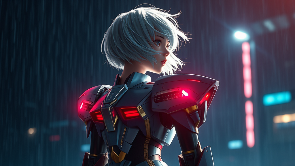 A girl donning intricately detailed Gundam armor stands alone on a dark, rainy night, her short white hair swept by the wind. The scene captures a cinematic masterpiece set in a stunning, surreal environment, illuminated by a divine, celestial glow that brings out the glossy surfaces of her armor. The atmosphere exudes a manga and anime aesthetic, with vibrant colors enhanced by cinematic lighting and lens flares, as if capturing the most dramatic moment in a hyperrealistic 4K render. Her presence is both ethereal and intense, reminiscent of a character brought to life through the advanced capabilities of Unreal Engine 5 and Octane rendering. The atmosphere is further enriched by the intricate detailing of the armor’s surface, the realism of the environment, and the cinematic composition, creating a breathtaking and immersive visual experience.