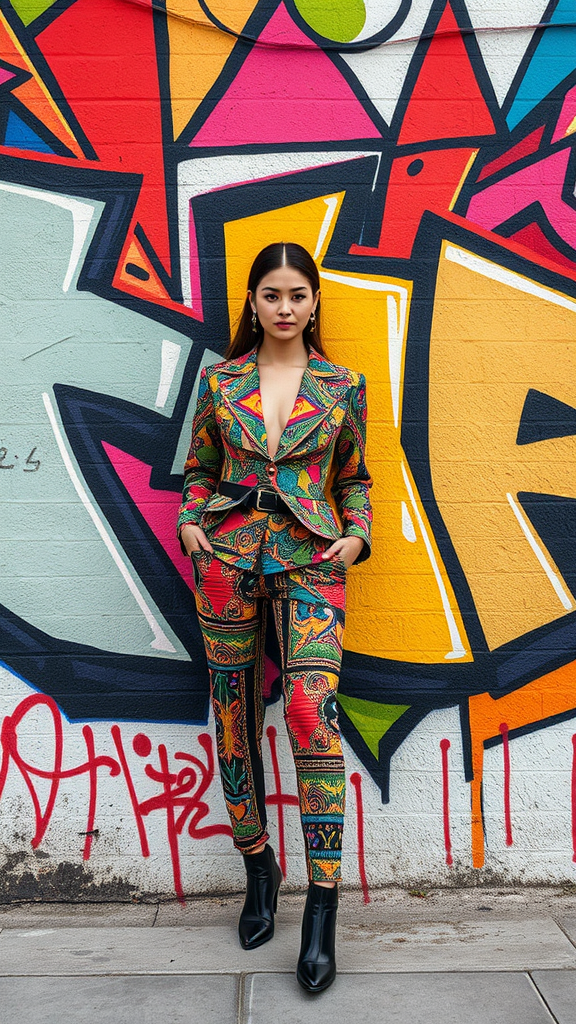 A 90s street photographer in Santiago captures a bold model posing against a vibrant wall filled with abstract graffiti composed solely of angular, colorful shapes. The model's outfit, reminiscent of Tokyo Fashion Week's cutting-edge style, seamlessly blends with the artwork behind her, featuring intricate patterns and hues that mirror the graffiti's energy and design. The entire scene radiates an electric fusion of fashion and urban art, creating a striking visual harmony.