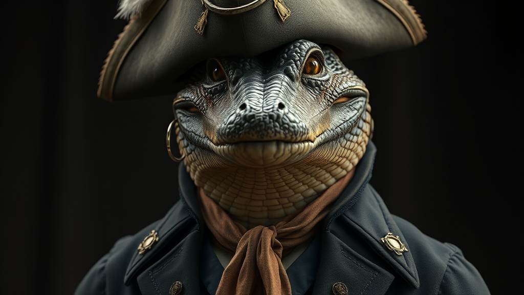 Realistic portrait of an anthropomorphic alligator wearing elaborate 18th-century pirate attire, featuring a weathered tricorn hat and ornate neck tie, designed as a captivating video game character with highly detailed features and textures. The scene is set with cinematic, dramatic lighting, emphasizing a moody atmosphere through dark, rich colors. The alligator's scales glisten subtly under HD, 4K rendering, showcasing HBO-inspired visuals. The portrait captures an intense gaze, adding depth and intrigue, with elements like a shimmering hoop earring and intricate embroidery on the coat enhancing the character's commanding presence.