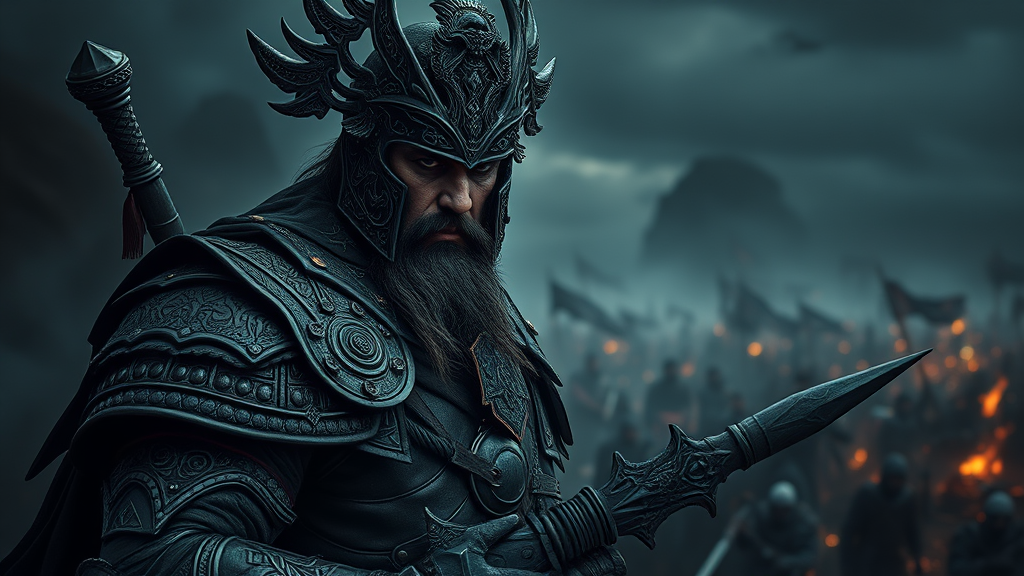 Intricate armor and weapon, dark tones palette, battlefield in background, militant pose, portrait, intense emotions like rage, anger, and power, epic composition, tribal dark fantasy, dramatic shadows, infused with an aura of formidable presence and raw energy, subtle interplay of light and shadow accentuating the intricate designs, the essence of a warlord commanding respect and fear on the chaotic battlefield, whispers of ancient tribal heritage etched into the armor, echoing tales of old battles and legendary feats.