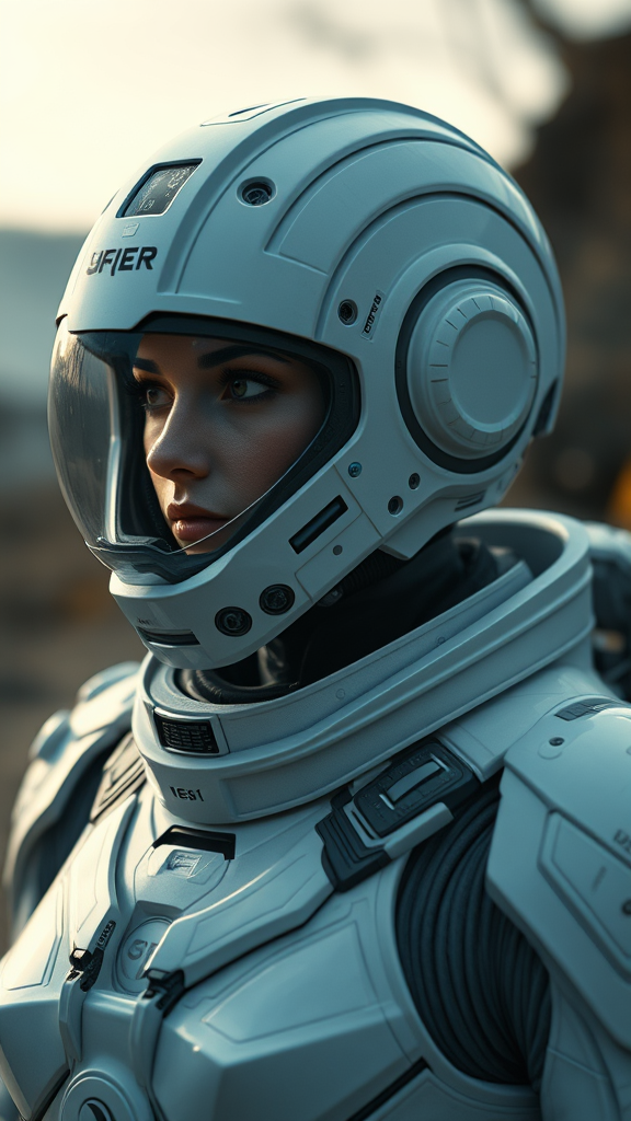 A white sci-fi female armor with intricate detail, featuring a cybernetic helmet and a full insulated spacesuit design. Her bald head enhances the futuristic aesthetic. The scene is set outdoors with natural light capturing the photorealism and cinematic style often seen in sci-fi movies. The armor is depicted with moody, cinematic lighting, showcasing the highest quality and detail through techniques like ray tracing. The image is presented in a third-person view with a blur effect and long exposure, offering an 8K ultra-HD resolution. The overall composition is dramatic and atmospheric, highlighting the intricacies of the armor in a stunning, high-detailed cinematic rendering.
