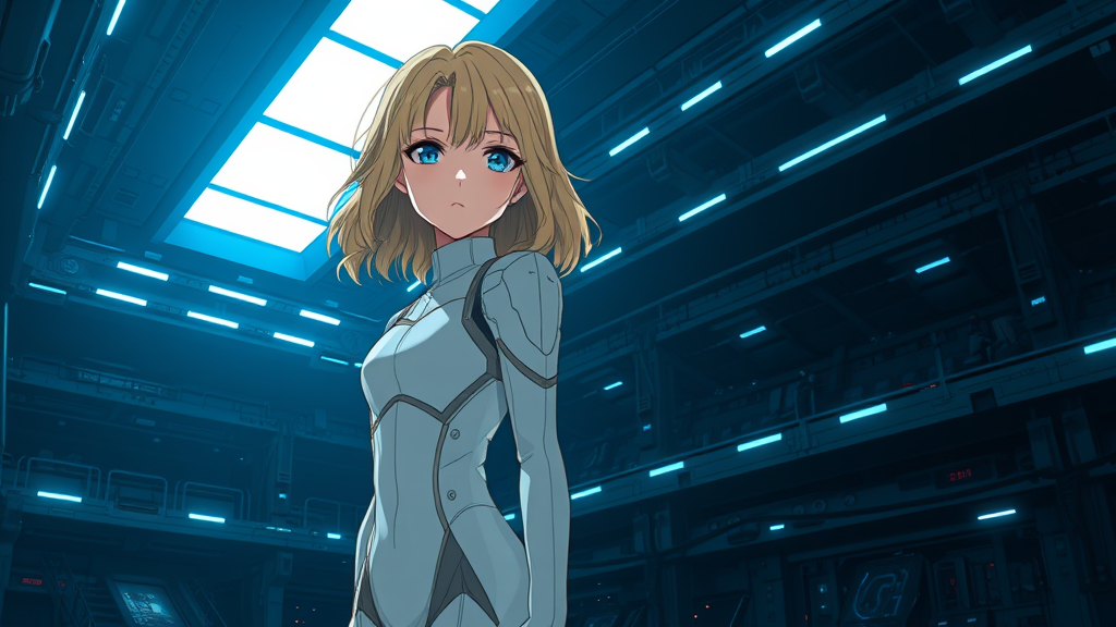 Anime art in the style of Tsutomu Nihei featuring a young girl in a sleek, white, form-fitting sci-fi jumpsuit. She stands amidst a cyberpunk setting inside the dimly lit interior of a futuristic spaceship. Her hair is a loose, natural blonde, flowing gently as if in a breeze, and she possesses stunning facial features with a cold, contemplative expression. The dramatic backdrop is dark and somber, evoking a sense of isolation in a cavernous room. The art style incorporates elements of manga, with precise lines and subdued color palettes. Muted shades of blue illuminate the scene with a bright light from one angle, casting sharp shadows and creating a sense of depth in the open, multi-tiered space. The setting is rich in detail, with sharp angles and intricate features, including clumps of energy and flashes of light. The atmosphere is both futuristic and complex, embodying hyper-detail and gigantism, with a slight blur in the background to emphasize the third-person portrait composition.